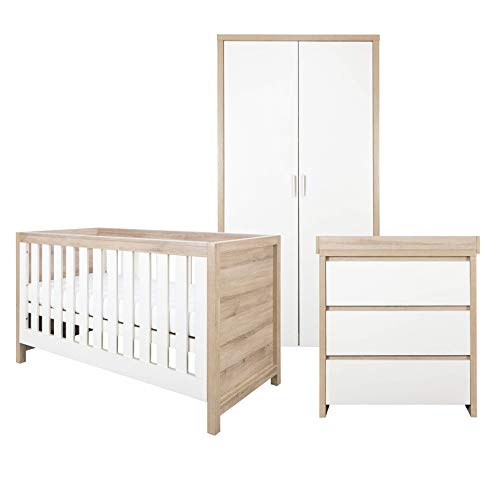 This set includes baby to toddler cot bed, chest of drawers with integrated changer top and wardrobe.
